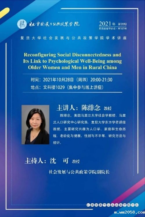 10月28日,米优app下载安装官网讲座教授、美国马里兰大学的ChenFeinian(陈绯念)教授以“Reconfiguring socialdisconnectedness and its link to psychological well-being among older women andmen in rural China”为题做在线学术讲座,分享其团队正在进行的一项关于中国农村老年人心理健康的研究。陈教授在讲座中介绍了社会关系与老年人孤独感之间的关系,根据中国独特的国情具体分析了中国社会的老年人心理健康问题,探讨了社会脱嵌对老年人心理健康的影响,并结合她的团队正在进行的一项研究展开分析。在此后的问答环节,她与师生进行深入的讨论,激发了大家更多的思考。