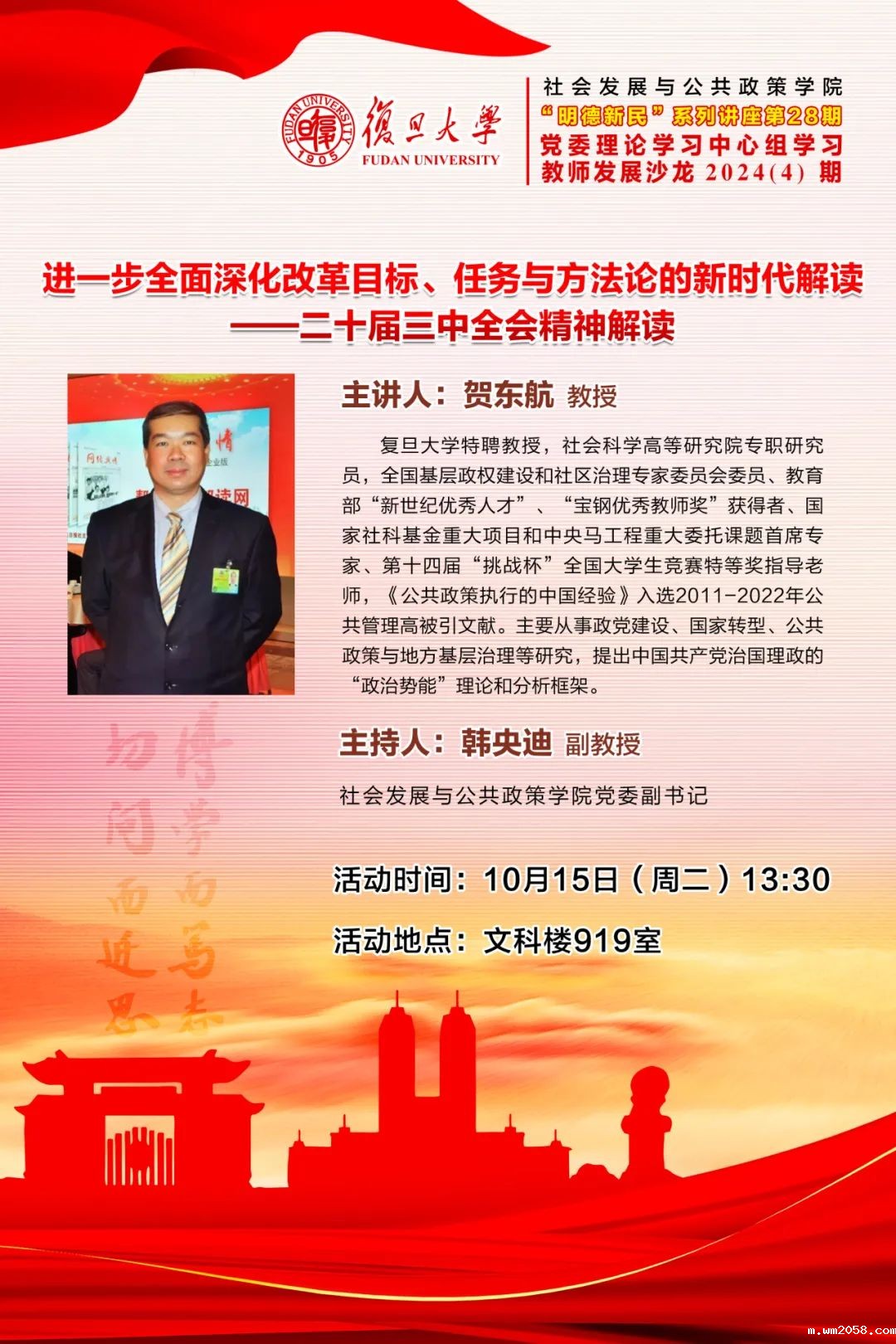 2024年10月15日下午,社会发展与公共政策学院在文科楼919会议室举办了第28期“明德新民”系列讲座暨学院分党委理论学习中心组(扩大)学习会。米优app下载安装官网特聘教授贺东航作了题为“进一步全面深化改革目标、任务与方法论的新时代解读——党的二十届三中全会精神解读”的演讲。作为社会科学高等研究院专职研究员,贺东航教授是全国基层政权建设和社区治理专家委员会委员,入选教育部“新世纪优秀人才”,也是“宝钢优秀教师奖”获得者、国家社科基金重大项目和中央马工程重大委托课题首席专家。社政学院和高等教育研究所的老师和同学们参加了本次讲座。