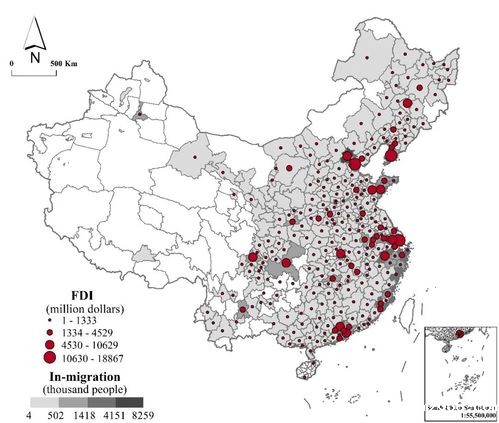 改革开放以来的中国国内人口迁移,堪称是世界范围内最大规模的人口迁移。据第七次人口普查数据显示,2020年我国有流动人口3.76亿,占城市人口数量的41.6%。绵延数千年的乡土中国转型为流动中国。理解这一转型的动力是重要的学术问题。本研究发现,中国国内人口迁移的迁入地与FDI流入地和出口行业所在地呈现惊人的一致性:高度聚集在东部沿海地区,如长三角、珠三角、京津冀、山东半岛和辽东半岛地区(见图1图2)。那么,经济全球化是否拉动了人口迁移?这个问题是这项合作研究的起点。